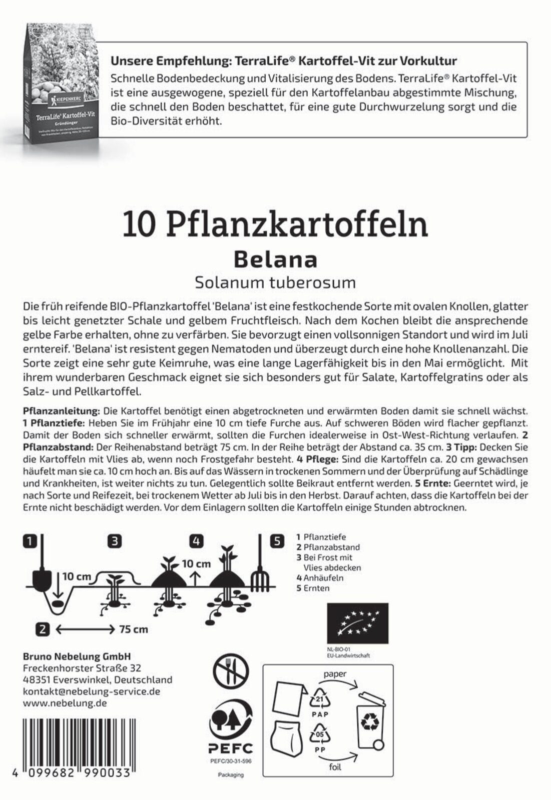 Die frühe Premiumsorte 'Belana' ist eine festkochende Speisekartoffelsorte aus biologischem Anbau und folglich in Bio-Qualität. 'Belana' wird im April gepflanzt und lässt sich im August ernten. Sie bevorzugt einen sonnigen bis halbschattigen Standort und ist resistent gegen Nematoden. Die ovalen Knollen haben eine glatte bis leicht genetzte Schale, gelbes Fruchtfleisch und sind gut lagerfähig. In der Küche eignet sie sich besonders gut für Salate, kann aber auch problemlos in Kartoffelgratins oder als Salz- und Pellkartoffeln verwendet werden.