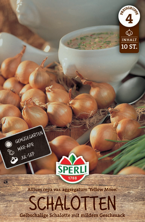 Die gelbschalige, runde Schalotte 'Yellow Moon' ist mild im Geschmack. Sie ist sehr gesund und hat einen kompakten Wuchs. Bereits im frühen Frühling kannst du diese Schalotte setzten. Sie ist sehr anspruchslos und damit einfach anzubauen. Sie wächst recht kompakt. Im Juli und August findet dann die Ernte der Schalotte 'Yellow Moon' statt.