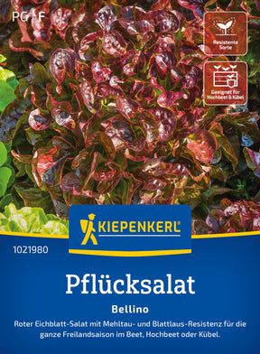 Der Pflücksalat 'Bellino' ist ein roter Eichblattsalat mit zarten Blättern und leicht nussigem Geschmack. Eine rasch wachsende, anbausichere Sorte mit guter Schossfestigkeit und Resistenzen gegen Falschen Mehltau und Salatblattläuse. Für die ganze Freilandsaison im Beet, Hochbeet oder Kübel. Er kann nach Bedarf blattweise oder als ganzer, lockerer Kopf geerntet werden.