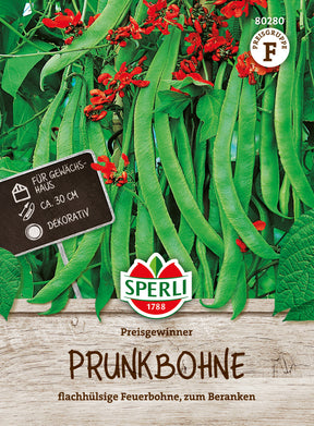 Die Prunkbohne 'Preisgewinner' eignet sich zum Begrünen, denn sie hat einen hohen Wuchs von etwa 2,5 m und rankt gut. So verziert sie beispielsweise Lauben, Zäune oder Balkone. Ihre schicken roten Blüten sind dabei ein zusätzlicher Hingucker. Die 'Preisgewinner' kann sowohl im Freiland als auch im Gewächshaus angebaut werden. Die vielen, sehr langen, fleischigen Hülsen enthalten violett bis rot gefärbte Körner mit schwarzen Sprenkeln. Von Juli bis September kannst Du die schmackhaften Bohnen ernten.