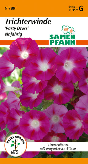 Ipomea purpurea Trichterwinde ’Party Dress’ Frühblühende, einjährige Kletterpflanze mit außergewöhnlichen, sehr dekorativen, leuchtenden, magentarosa Blüten. Gut geeignet für Spaliere, Zäune, Pergolen usw. Wird gern als Sichtschutz angepflanzt.