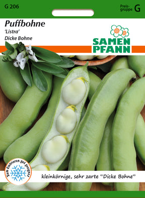 Vicia faba Puffbohne ’Listra’ ’Listra’ ist eine aufrecht wachsende, frühe Puffbohne mit grünweißen kleinen Körnern. Die Sorte ist robust gegen kalte Witterung, bringt hohen Ertrag und reift sehr früh. Die langen dunkelgrünen Hülsen enthalten ca. 5-6 zarte Körner. Puffbohnen werden auch Saubohnen oder Dicke Bohnen genannt. Verwendet werden die jungen zarten Körner als Bohnengemüse und Salat.