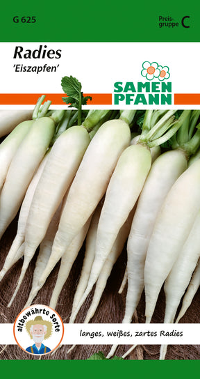 Raphanus sativus Radies ’Eiszapfen’ Weißes, kurzlaubiges, wohlschmeckendes Radies mit 10-12 cm langen Wurzeln. Für Anbau im Freiland und zum Treiben. Raschwüchsig. Reifezeit ca. 50 Tage.