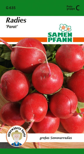 Raphanus sativus Radies ’Parat’ Großes, karminrotes, nicht pelzig werdendes Radies mit mildem, zartem Geschmack. Reifezeit ca. 25-30 Tage. Vitamin B und C. ’Parat’ hat den Vorzug auch im Sommer lange festfleischig zu bleiben.