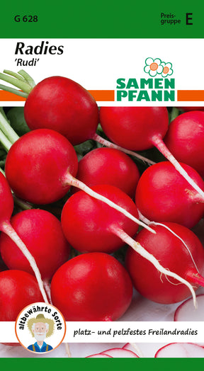 Raphanus sativus Radies ’Rudi’ Bewährtes frühes Freilandradies, Standardsorte im Profianbau. Platz- und pelzfeste Knolle, früh reifend, für ganzjährigen Anbau geeignet. Auch für Anbau im Frühbeet oder unter Folie geeignet. Stabiles mittellanges Laub, sehr widerstandsfähig gegen Falschen Mehltau.