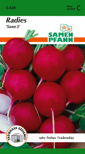 Raphanus sativus Radies ’Saxa 3’ Ein schnellwüchsiges, rundes leuchtendrotes Treibradies mit kurzem Laub, welches bereits etwa 25 Tage nach der Aussaat geerntet werden kann. Für den Anbau im Treibhaus, Frühbeet oder unter Folie und später im Freiland geeignet.