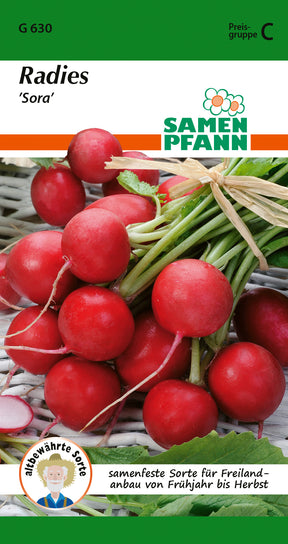 Raphanus sativus Radies ’Sora’ Großes, festfleischiges, leuchtend rotes Freilandradies mit mittellangem Laub. Die Knolle ist rund, platzfest und widerstandsfähig gegen Pelzigkeit. Für Freilandanbau von Frühjahr bis Herbst.