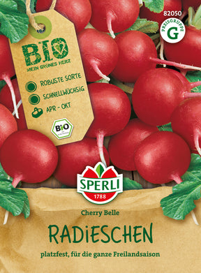 Das BIO-Radieschen 'Cherry Belle' von SPERLI ist eine robuste Sorte für die ganze Freilandsaison. Schon im März ist Aussaat möglich, am besten in ein lockeres, humusreiches Gartenbeet. Für den optimalen Ernteerfolg sollte alle 2 bis 3 Wochen neu ausgesät werden, denn so entwickeln sich von April bis in den Oktober laufend neue, raschwüchsige Radieschen. Zudem ist es ratsam, die Knollen mit einem Vlies oder Netz abzudecken, um sie vor Schädlingen zu schützen. Die Radieschen in zertifizierter BIO-Qualität punkten durch ihre leuchtend rote Schale und ihren wunderbar milden Geschmack. Einfach ausprobieren!
