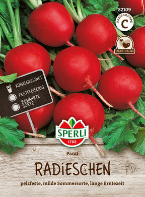 Bei dem Radies 'Parat' von SPERLI handelt es sich um eine milde Sommersorte mit langer Erntezeit. Die Radieschen sind besonders groß und festfleischig und werden auch im Hochsommer nicht pelzig. Ihre Haut ist dünn und karminrot, ihr Geschmack mild und aromatisch. 'Parat' ist geeignet für Folgeaussaaten alle 2 bis 3 Wochen. Ein lockerer, humoser Boden ist die beste Grundlage für eine erfolgreiche Anzucht. Um die Pflanzen vor der Rettichfliege zu schützen, können sie mit einem Gemüsenetz überspannt werden.
