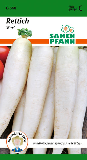 Raphanus sativus Rettich ’Rex’ Mild-würziger, schnellwüchsiger, halblanger weißer Rettich für Treiberei und ganzjährigen Freilandanbau. Sehr gut für Folienkultur geeignet. ’Rex’ hat ein aufrechtes, breites Laub, gute Pelzigkeitsresistenz. Er kann nach ca. 6 Wochen geerntet werden.