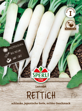 Der Rettich 'Lancelot' ist eine F1-hybride Sorte mit einem milden Geschmack. Die leuchtend weißen Wurzeln erreichen eine Länge von bis zu 40 cm, haben eine glatte Oberfläche und sind sehr festfleischig. Die Samen werden im Zeitraum von April bis August an sonniger Stelle direkt im Freiland ausgebracht. Bewährt hat sich für eine erfolgreiche und problemlose Anzucht ein lockerer Boden, der gleichmäßig feucht gehalten werden sollte. Die Pflanzen sollten rechtzeitig vereinzelt und mit einem Insektenschutznetz vor der Rettichfliege geschützt werden, damit die Ernte ab Juni gesichert und ertragreich ist.