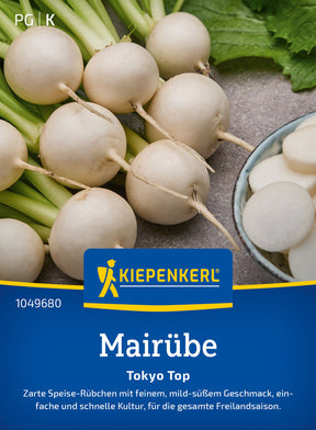 Die Mairübe 'Tokyo Top' bildet zarte, weiße, kleine Rüben. Diese haben, frisch in Salaten, als Rohkost, gekocht oder gedünstet, einen angenehm milden Geschmack. Die Ernte erfolgt bereits 4-5 Wochen nach der Aussaat ab einem Durchmesser von 5-6 cm.