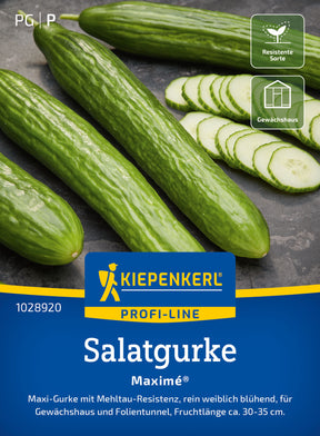 Die Salatgurke 'Maximé®' bildet dunkelgrüne, 30-35 cm lange, bitterfreie, kernarme Früchte. Sie ist rein weiblich blühend, aus jeder Blüte entwickelt sich ohne Befruchtung eine Frucht. Eine robuste, wüchsige Sorte mit Eignung für ungeheizte Hobby- Gewächshäuser oder Folientunnel. Sie ist resistent gegen Echten Mehltau. Wuchshöhe 150-200 cm.