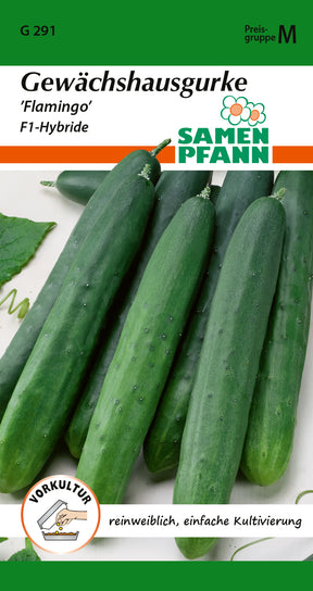 Cucumis sativus Gurke, Gewächshausgurke ’Flamingo, F1-Hybride’ Reinweibliche, knackige, dunkelgrüne Salatgurke mit ca. 35 cm langen schlanken, glatten Früchten. Bewährte Sorte für den ganzjährigen Anbau im Gewächshaus. Resistent gegen Gurkenkrätze. Ausgezeichnetes Regenerations- und Durchhaltevermögen.