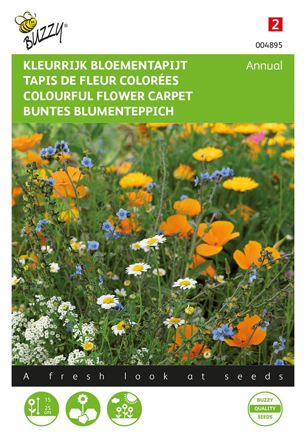 Buntes Blumenteppich - Jährlich Ab Mitte April bis Ende Juni ins Freiland breitwürfig oder in Reihen einsäen. Eine wunderschöne, farbenfrohe Mischung aus Pflanzen, die sich besonders gut zwischen Steinen, Fliesen und im Steingarten eignen.