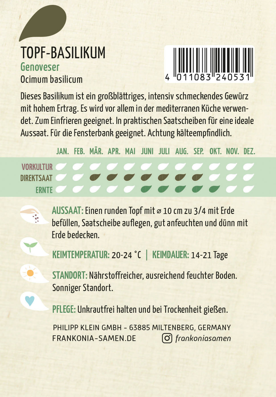 Dieses Basilikum ist ein großblättriges, intensiv schmeckendes Gewürz mit hohem Ertrag. Es wird vor allem in der mediterranen Küche verwendet. Zum Einfrieren geeignet. In praktischen Saatscheiben für eine ideale Aussaat. Für die Fensterbank geeignet. Achtung kälteempfindlich.