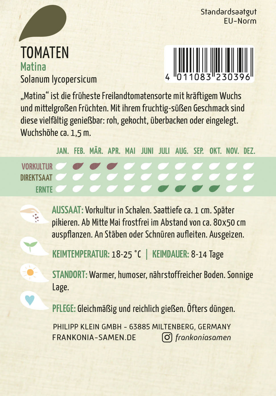 "Matina" ist die früheste Freilandtomatensorte mit kräftigem Wuchs und mittelgroßen Früchten. Mit ihrem fruchtig-süßen Geschmack sind diese vielfältig genießbar: roh, gekocht, überbacken oder eingelegt. Wuchshöhe ca. 1,5 m.