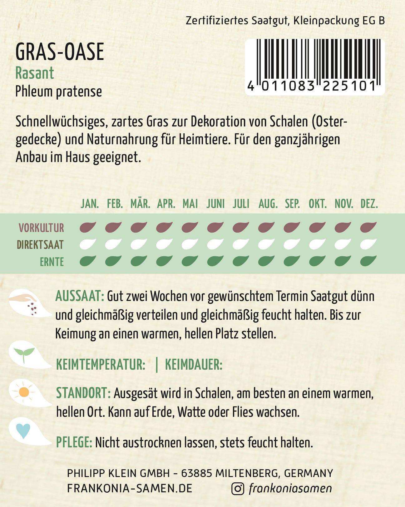 Schnellwüchsiges, zartes Gras zur Dekoration von Schalen (Ostergedecke) und Naturnahrung für Heimtiere. Für den ganzjährigen Anbau im Haus geeignet.