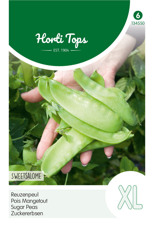 Zuckererbse - Sweetsalome Von Anfang März bis einschließlich Mai in Reihen im Freien aussäen. Die auffällig großen, hellgrünen Schoten werden durchschnittlich 9 cm lang und 3 cm breit. Die Schoten erntet man am besten, bevor die Samen sichtbar sind, wenn sie die zarteste Struktur und den süßesten Geschmack aufweisen.