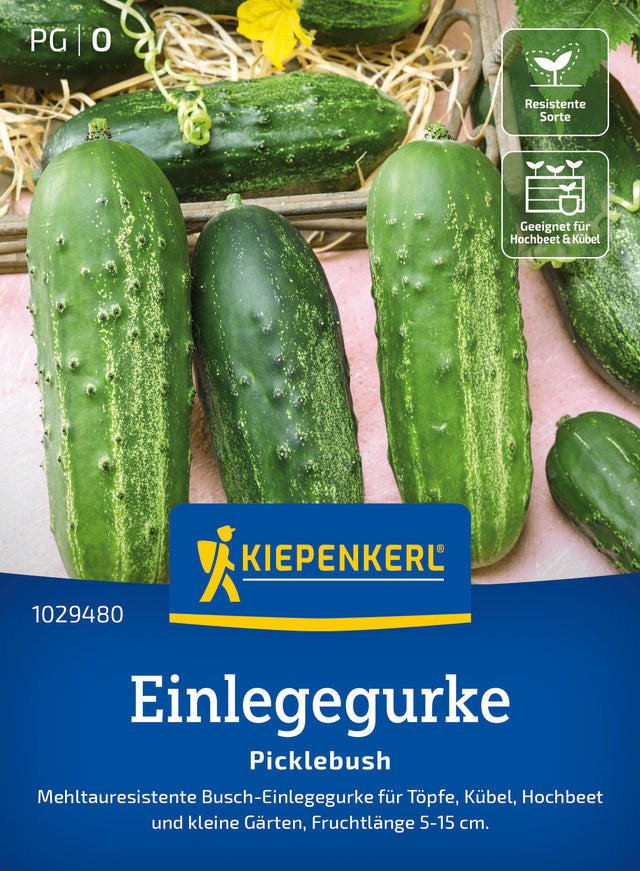 Die Busch-Einlegegurke 'Picklebush' wächst kompakt mit ca. 60 cm lang werdenden Trieben und ist gemischt blühend. Ideal für Töpfe, Kübel, Hochbeete und kleine Gärten. 'Picklebush' bildet dunkelgrüne, leicht gestachelte Früchte. Verwendung zum Einlegen oder auch frisch als Mini-Salatgurke. Resistent gegen Echten Mehltau, Gurkenkrätze und Mosaikvirus. Im Topf oder Hochbeet eine Rankhilfe geben, im Beet bodendeckend wachsen lassen. Wuchshöhe 50-70 cm.