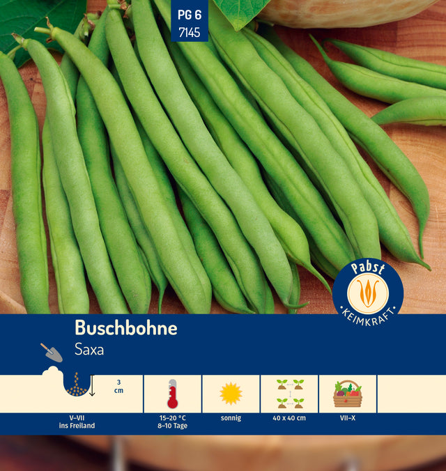 'Saxa' ist eine rundhülsige, dickfleischige Brechbohne ohne Fäden. Sie ist eine bewährte, frühe Sorte und kann über einen langen Zeitraum geerntet werden. Se und eignet sich für Frischverbrauch, Nass- und Gefrierkonservierung. Tipp: Für hohe Erträge und beste Qualität rechtzeitig mit der Ernte beginnen und mehrfach durchernten.