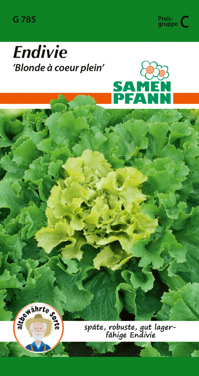 Cichorium endivia Endivie ’Blonde à coeur plein’ Glatte, leicht gewellte, breite, gelbgrüne Blätter umschließen das volle, goldgelbe Herz.