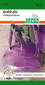 Brassica oleracea Kohlrabi ’Delikateß blauer’ Beliebte, mittelfrühe Freilandsorte, die nicht schnell holzig wird. Sie entwickelt zarte, runde Knollen. Für Folgesaaten im Sommer sehr gut geeignet.