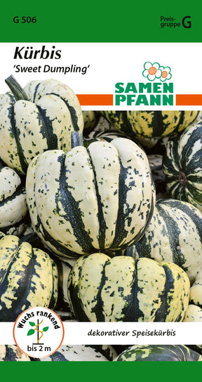Cucurbita pepo Kürbis, Mini-Speisekürbis ’Sweet Dumpling’ Dekorativer, wohlschmeckender, kleiner, runder Speisekürbis, cremeweiß mit grünen Längsrillen. Das gelborange Fruchtfleisch hat einen süßen, zarten, nicht faserigen, kastanienähnlichen Geschmack. Die Früchte werden ca. 7-8 cm groß, ca. 300-500 g schwer. Gut lagerfähig. Kann roh oder gekocht gegessen werden, gut zum Füllen geeignet, kann mit Schale gegessen werden.