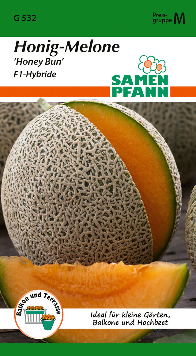 Cucumis melo Melone ’Honey Bun’, F1-Hybride Sehr frühe Mini-Cantaloupemelone mit orangem Fleisch. Süß wie Honig. Produziert 3 bis 4 kleine Melonen pro Pflanze. Kompakte, buschige Sorte mit wenig Platzbedarf, ideal für Topfkultur oder den kleinen Garten. Gewicht 400-600 g.