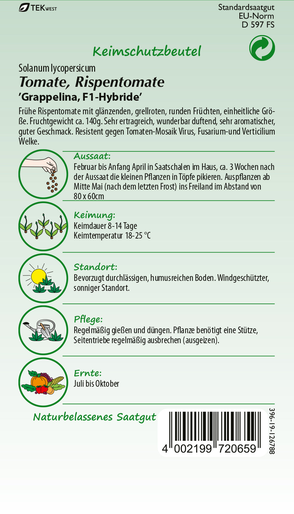 Solanum lycopersicum Tomate, Rispentomate ’Grappelina, F1-Hybride’ Frühe Rispentomate mit glänzenden, grellroten, runden Früchten, einheitliche Größe. Fruchtgewicht ca. 140g. Sehr ertragreich, wunderbar duftend, sehr aromatischer, guter Geschmack. Resistent gegen Tomaten-Mosaik Virus, Fusarium-und Verticilium Welke.