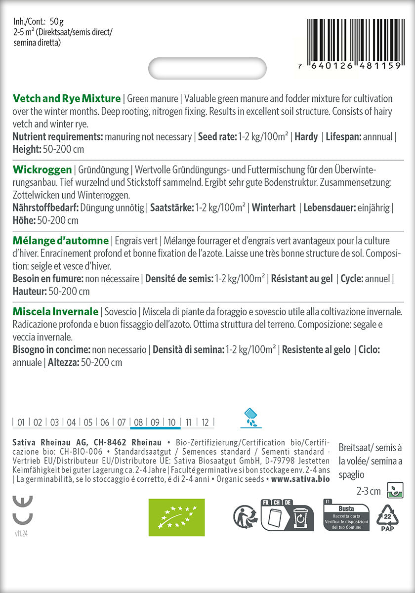 Wertvolle Gründüngungs- und Futtermischung für den Überwinterungsanbau. Tief wurzelnd und Stickstoff sammelnd. Ergibt sehr gute Bodenstruktur. Zusammensetzung: Zottelwicken und Winterroggen.