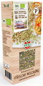 Die Frische Mischung ist mit ihrem milden-frischen Geschmack ein Highlight in jedem Salat. Wir empfehlen Dir die Kultur in der SPERLI Sprossenbox. Bereits nach 4-6 Tagen sind die Sprossen erntereif. Anwendung: Das Gefäß an einen hellen Ort ohne direkte Sonneneinstrahlung stellen. Bis zur Ernte täglich 2- bis 3-Mal spülen. Tipps: Keimsaat eine Nacht in Wasser vorquellen. Verzehrfertige Sprossen sind im Kühlschrank einige Tage haltbar. Sie sollten vor dem Verzehr nochmals gespült werden. Inhalt: 30% Alfalfa, 10% Linsen braun, 10% Linsen rot, 40% Mungbohnen, 10% Rettich.
