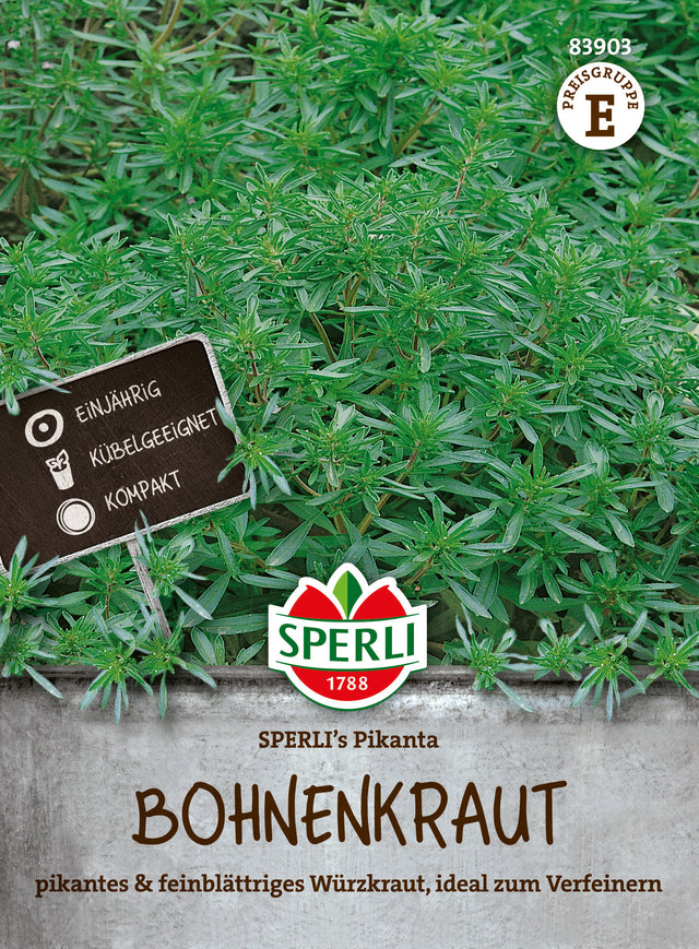 Das einjährige Bohnenkraut 'SPERLI's Pikanta' ist ein ideales Würzkraut für Eintöpfe, Soßen, Salate und natürlich Bohnengerichte mit einem pfefferig-würzigen Geschmack. Es wächst besonders feinblättrig und kompakt, ist dabei unempfindlich gegen schlechte Witterungsbedingungen und gedeiht auch noch unter weniger guten Lichtverhältnissen. 'Pikanta' liebt einen sonnigen Standort und nährstoffreichen, lockeren, gut durchlässigen Boden. Hier kann es von April bis Juni ausgesät werden. Die jungen Blätter werden im Zeitraum von Juni bis Oktober noch vor der Blüte der Pflanzen geerntet.