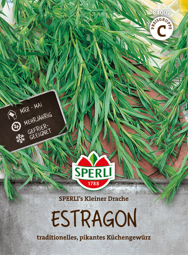 Der Estragon 'SPERLI's Kleiner Drache' ist eine mehrjährige, traditionelle Gewürz- und Heilpflanze mit pikant-würzigem Geschmack. Er eignet sich ideal als Einlegegewürz oder zum Aromatisieren von Soßen, Fisch und Geflügel. 'SPERLI's Kleiner Drache' kann von April bis Mai im Haus vorkultiviert werden. Ab Mitte Mai erfolgt dann die Pflanzung ins Freiland. Alternativ ist eine Aussaat auch direkt ins Freiland möglich, und zwar von Mai bis Juni. Nährstoffreiche, humose und feuchte Gartenböden sind für Estragon eine hervorragende Wachstumsgrundlage. Die Erntezeit erstreckt sich von Juli bis November. Damit die Pflanzen im Frühjahr wieder austreiben, ist ein Rückschnitt im Herbst erforderlich.