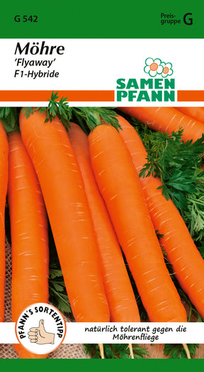 Daucus carota Möhre ’Flyaway’, F1-Hybride ’Flyaway’ ist eine mittelfrühe, carotinreiche, zuckersüße, ca. 15-18 cm lange Möhre. Natürliche Toleranz gegen die Maden der Möhrenfliege durch Auslese bei der Züchtung (keine Gentechnik). Aufgrund eines sehr geringen Chlorogensäuregehaltes bleiben die Pflanzen vom Befall der Möhrenfliege, und somit vom schädlichen Fraß der Maden, weitestgehend verschont. Zum Einlagern geeignet.