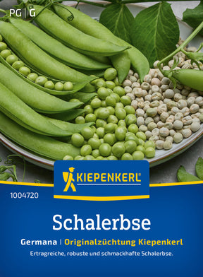 Die Schalerbse 'Germana' bildet selbst unter rauhen Bedingungen lange, paarige Hülsen mit 9-11 Körnern. Die Körner sind glatt, würzig und weniger süß. 'Germana' benötigt eine Kletterhilfe. Zur frischen Verwendung und Tiefgefrieren, ernten sobald sich die Körner gut entwickelt haben. Zum Trocknen die Hülsen abreifen lassen, die Erbsen aus den Hülsen lösen und nachtrocknen lassen. Erbsen binden Stickstoff aus der Luft und sind damit wichtig für die Fruchtfolge. Wuchshöhe ca. 70-80 cm.