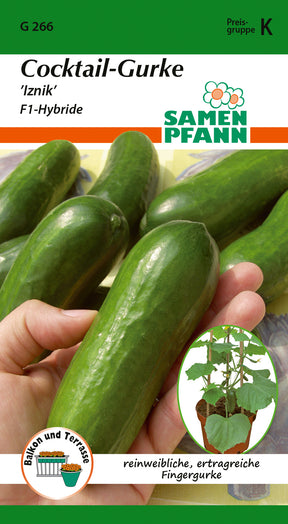 Cucumis sativus Gurke, Cocktail-Gurke ’Iznik’, F1-Hybride Frischgrün glänzende, glattschalige Fingergurke mit ca. 10 cm langen Früchten. Reinweiblich blühend, Parthenocarper Fruchtansatz, sehr frühzeitig und ertragreich mit bis zu 5 Früchten pro Blattachsel. Kompakter Wuchs mit kleinen Blättern. Ideal für Kübel und Topf auf Balkon und Terrasse. Intensiver Gurkengeschmack, knackig frisches Snackgemüse. Resistent gegen Echten Mehltau und Gurkenkrätze.