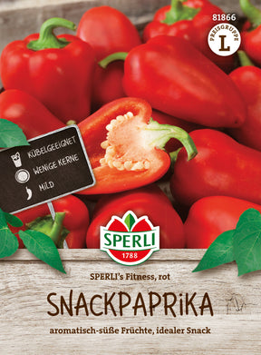 Saftige, fruchtig-süße Früchte zum Naschen bringt die Paprika 'SPERLI's Fitness, rot' hervor. Da sie nur wenige Samen im oberen Teil enthalten, können die Früchte direkt von den Pflanzen geerntet und verzehrt werden. Sie eignen sich aber auch zum Füllen, Kochen, Braten und Grillen und für Salate. Im Juli können die roten Früchte, die ca. 7 bis 9 cm lang und 5 cm breit sind, von den üppig wachsenden Pflanzen geerntet werden. Wichtig für eine erfolgreiche Kultur ist ein sonniger, windgeschützter Standort.