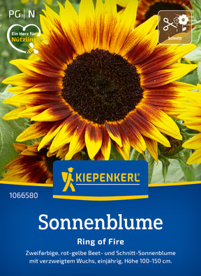 Die Sonnenblume 'Ring of Fire' ist eine standfeste, halbhoch wachsende, reichverzweigte Sorte mit vielen blühfreudigen Seitentrieben. Die lange blühenden, goldgelben Blüten besitzen einen tiefroten Ring um die dunkle Mitte. Ideal für den Schnitt und dank des buschigen Wuchses mit schöner Wirkung im Beet. Bester Schnittzeitpunkt für die Vase ist beim Aufblühen der Knospen.