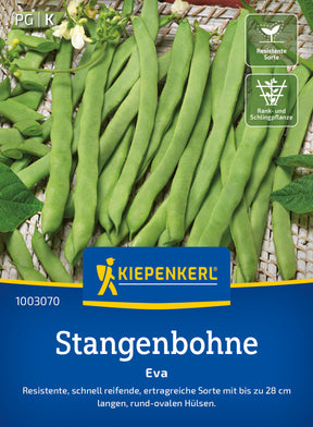 Die Stangenbohne 'Eva' bildet schnell bis zu 28 cm lange, fleischige, dunkelgrüne, fadenlose Hülsen. Resistent gegen Mosaikvirus, geeignet auch fürs Gewächshaus. Zur Konservierung die Hülsen waschen, schnibbeln, blanchieren und einfrieren. Bohnen nicht roh verzehren. Wuchshöhe 200-300 cm.