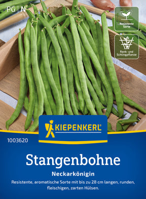 Die Stangenbohne 'Neckarkönigin' bildet ca. 28 cm lange, fleischige, fadenlose, aromatische Hülsen. Sie ist resistent gegen das Mosaikvirus. Zur Konservierung die Hülsen waschen, schnibbeln, blanchieren und einfrieren. Bohnen binden Stickstoff aus der Luft und sind damit wichtig für die Fruchtfolge. Bohnen nicht roh verzehren. Wuchshöhe 200-300 cm.