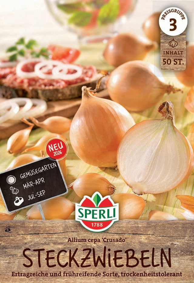 Die Steckzwiebel „Crusado“ von Sperli überzeugt mit großen, runden Zwiebeln und goldgelber Schale. Die frühreifende Sorte liefert hohe Erträge und zeigt gute Trockenheits- sowie Hitzetoleranz. Ideal für den Freilandanbau, punktet sie auch mit guter Lagerfähigkeit. Gepflanzt wird im Frühjahr in sonnigen, nährstoffreichen Boden mit 20–25 cm Reihen- und 10–15 cm Pflanzabstand.