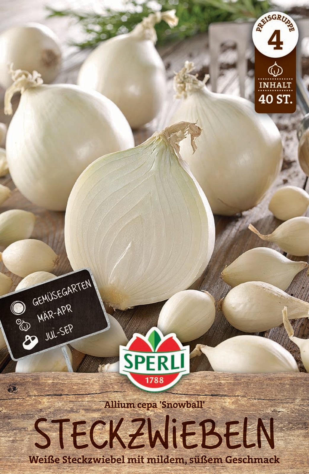 Die beliebte Steckzwiebel 'Snowball' ist eine weiße Zwiebel, die sich durch den milden, süßen Geschmack auszeichnet und ab Juli geerntet werden kann.