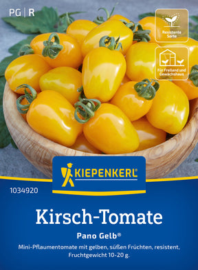Die Kirschtomate 'Pano Gelb®' bildet kleine, gelbe, sehr süße, längliche, 15-20 g schwere Früchte zur Ernte als Einzelfrucht. Ideal zum Naschen direkt von der Pflanze. Sie eignet sich fürs Gewächshaus, größere Kübel, aber auch für geschützte Stellen im Freiland und ist resistent gegen verschiedene Welke- und Blattkrankheiten. Wuchshöhe 150-200 cm.