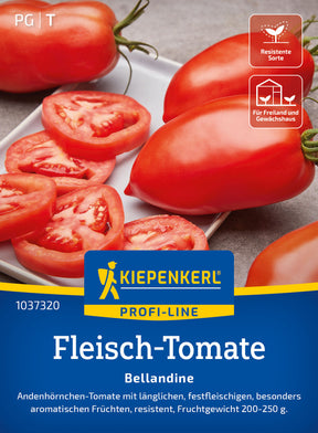 Die Fleischtomate 'Bellandine' ist eine Andenhörnchen-Tomate mit länglichen, roten, 200-250 g schweren, festfleischigen Früchten mit fruchtigem Aroma. Ideal als Schnitttomate, zum Kochen und Grillen. Geeignet für geschützte Stellen im Freiland, aber auch fürs Gewächshaus und größere Kübel. Resistent gegen verschiedene Welke- und Blattkrankheiten und Nematoden. Wuchshöhe 150-200 cm.