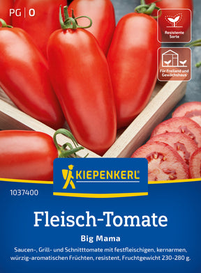 Die Fleischtomate 'Big Mama' ist eine festfleischige, kernarme Saucen-, Grill- und Schnitttomate mit ovalen, roten, 230- 280 g schweren Früchten mit würzigem Aroma. Geeignet für geschützte Stellen im Freiland, aber auch fürs Gewächshaus und größere Kübel. Resistent gegen verschiedene Welke- und Blattkrankheiten. Wuchshöhe 150-200 cm.