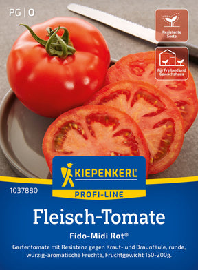 Die Fleischtomate 'Fido-Midi Rot®' bildet rote, runde, würzigaromatische, 150-200 g schwere Früchte. Ideal als Schnitttomate für Salate, zum Kochen und Grillen. Besonders geeignet dank ihrer Resistenz gegen Kraut- und Braunfäule für geschützte Stellen im Freiland, aber auch fürs Gewächshaus und größere Kübel. Wuchshöhe 150-200 cm.