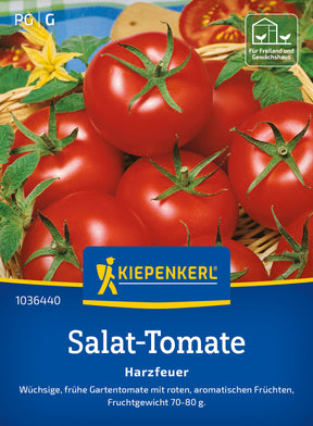Die Salattomate 'Harzfeuer' bildet früh runde, rote, 70-80 g schwere Früchte mit gutem Tomaten-Aroma zur Ernte als Einzelfrucht. Sie eignet sich für geschützte Stellen im Freiland, aber auch fürs Gewächshaus und größere Kübel und ist resistent gegen verschiedene Welke- und Blattkrankheiten und Mosaikvirus. Wuchshöhe 150-200 cm.