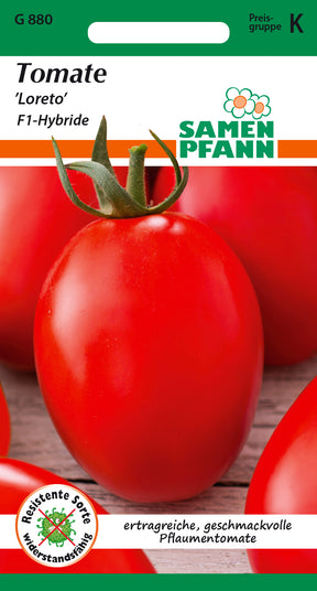 Solanum lycopersicum Tomate ’Loreto, F1-Hybride’ Pflaumentomate mit offenen, kräftigen Pflanzen im Typ Hellfrucht. Regelmäßiger Trossaufbau, leichter Fruchtansatz, guter Geschmack, hoher Ertrag. Fruchtgewicht ca. 70-90 Gramm. Hohe Resistenz gegen Tomatenmosaikvirus, Verticillium-Welke und Fusarium.
