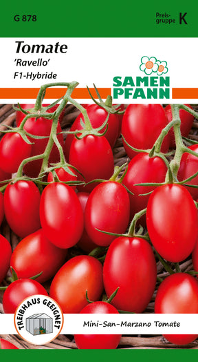 Solanum lycopersicum Tomate ’Ravello’, F1-Hybride Sehr frühe Mini-San-Marzano-Tomate mit ausgezeichnetem Geschmack. Hat ca. 25 g schwere, uniforme Früchte von tiefroter Farbe, mit langer Festigkeit. Für Rispenernte geeignet, bewährt im Unterglasanbau und im Freiland. ’Ravello’ ist resistent gegen u. a. Fusarium-Welke, Tomaten-Fleckenkrankheit und Tabakmosaikvirus.